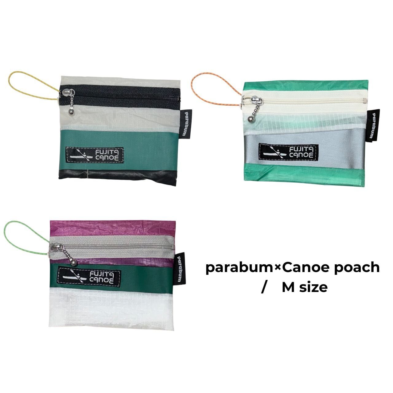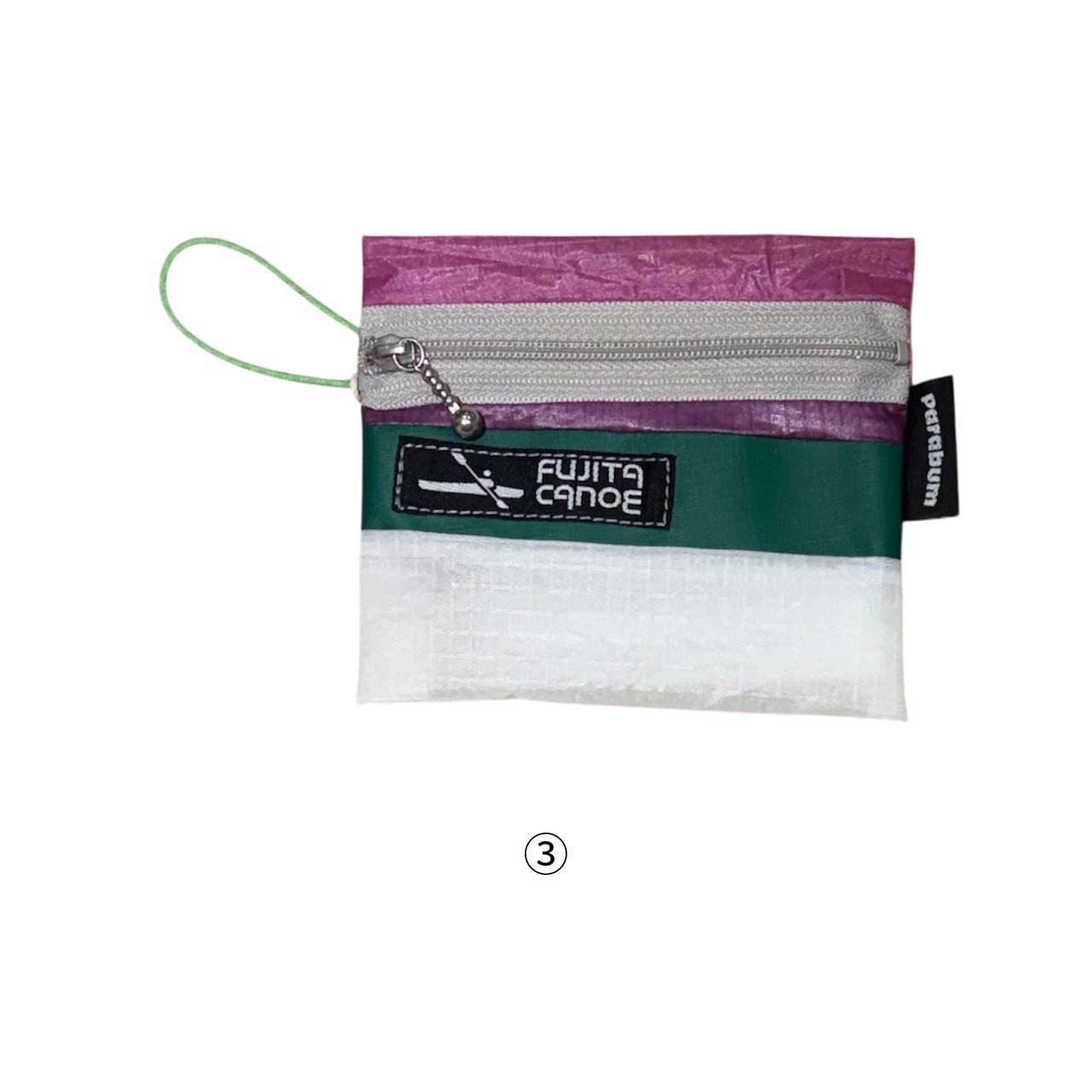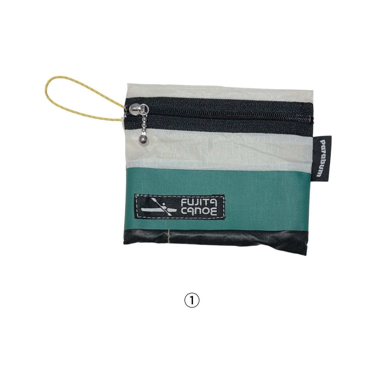 本体には、使用されなくなったパラグライダーの生地と、カヌーのハギレ、2つの素材を組み合わせて仕立てたポーチです。