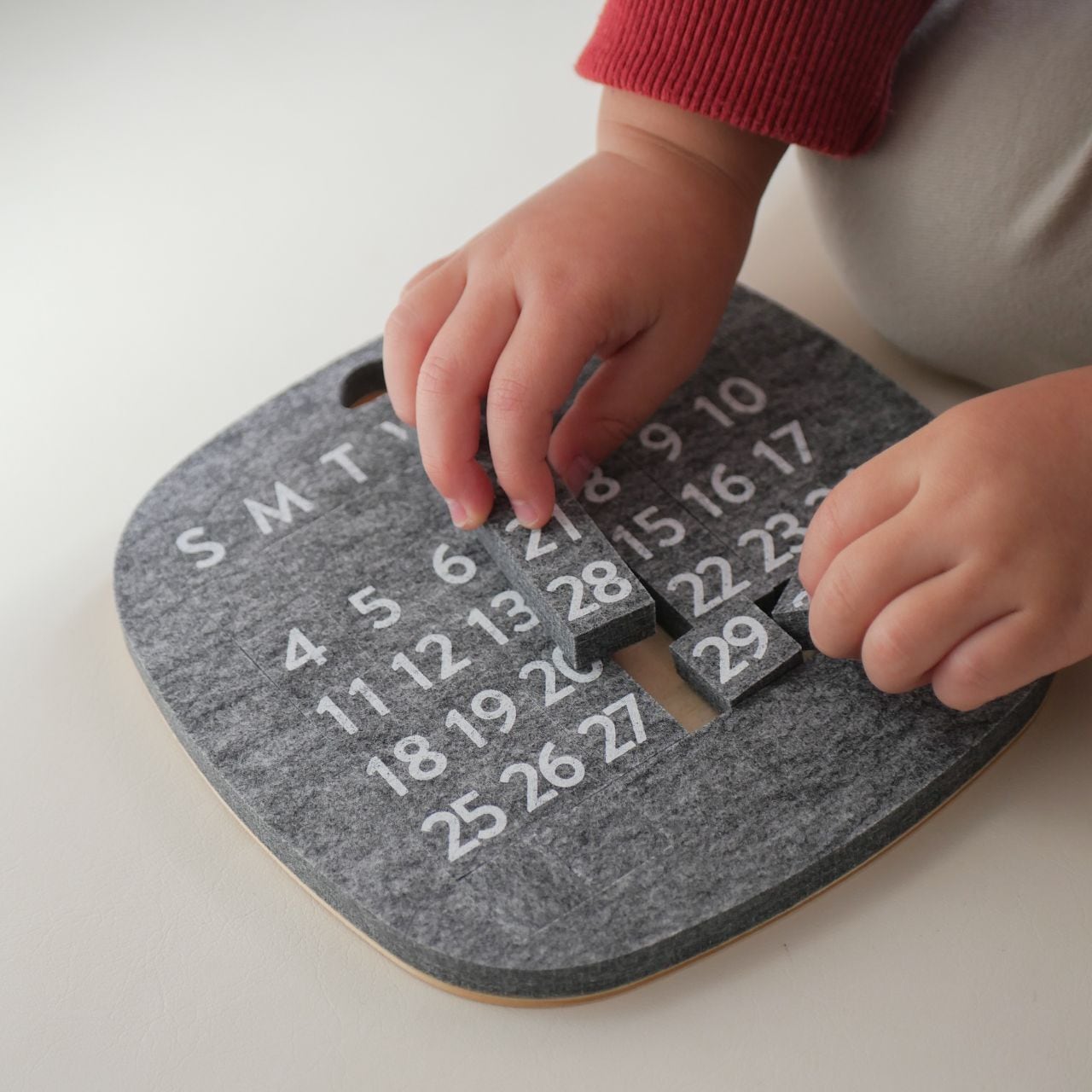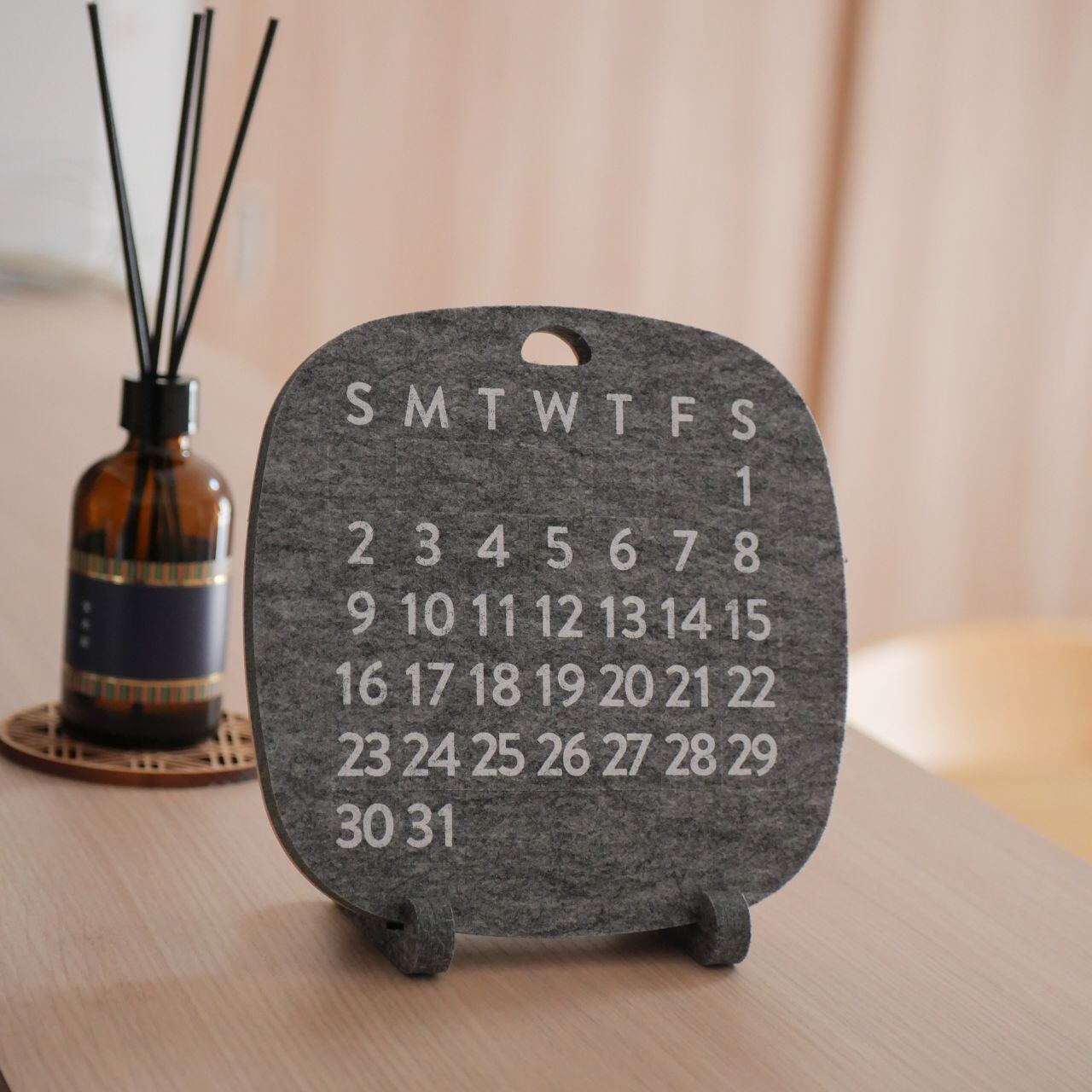 硬質フェルトと木を組み合わせた万年カレンダーです。使わない日付は裏の無地面にすることで、うるう年にも対応しています。卓上と壁掛けで使用でき、背面のマグネットで冷蔵庫などに貼り付けもできます。